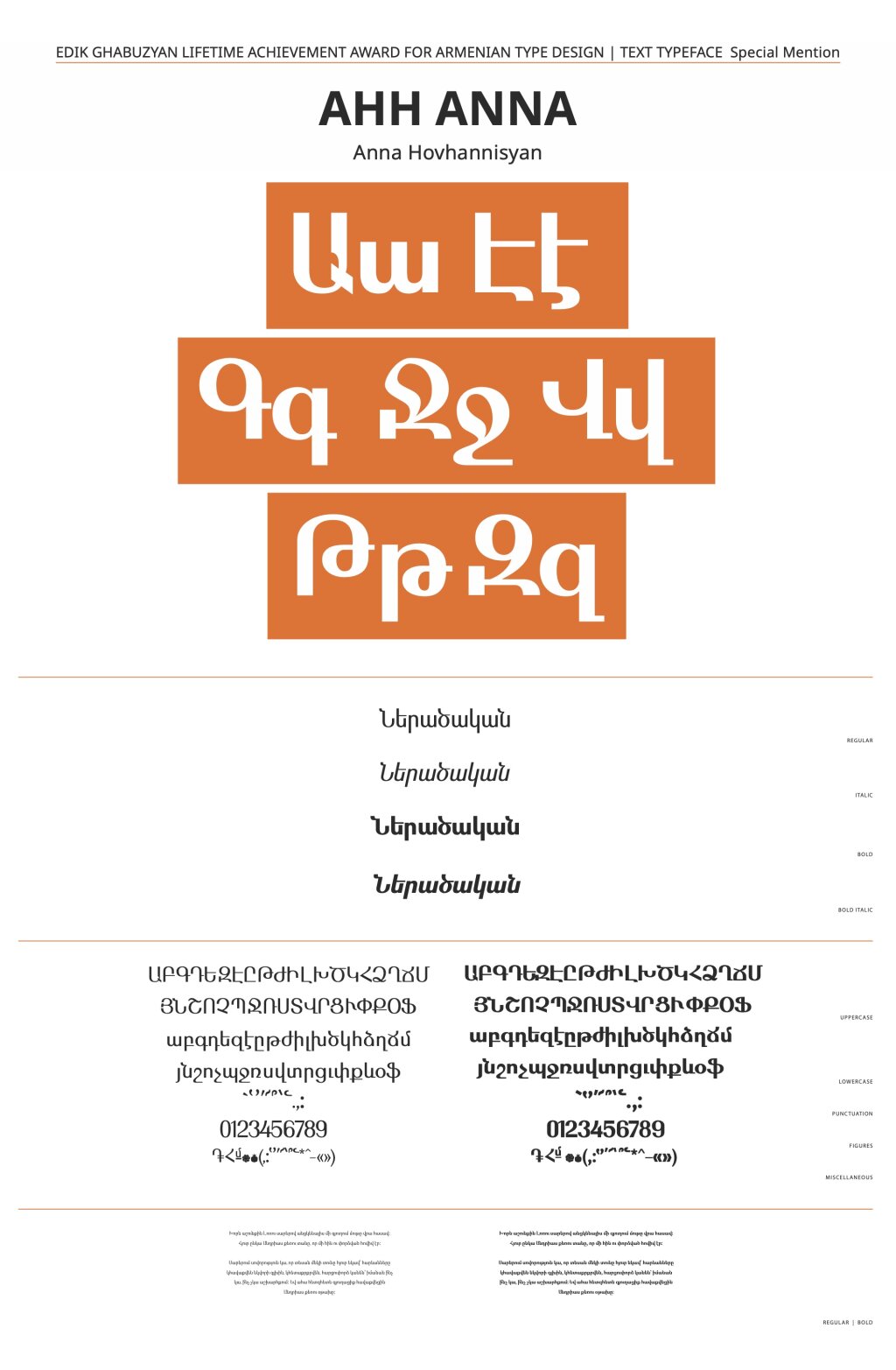 Rather nice text typeface with correct letterforms and proportions. Key dimensions are correct across all letterforms. The peculiarities of Armenian letters are preserved, the ascenders and descenders are executed in a correct size. Easy readable in all sizes and weights.