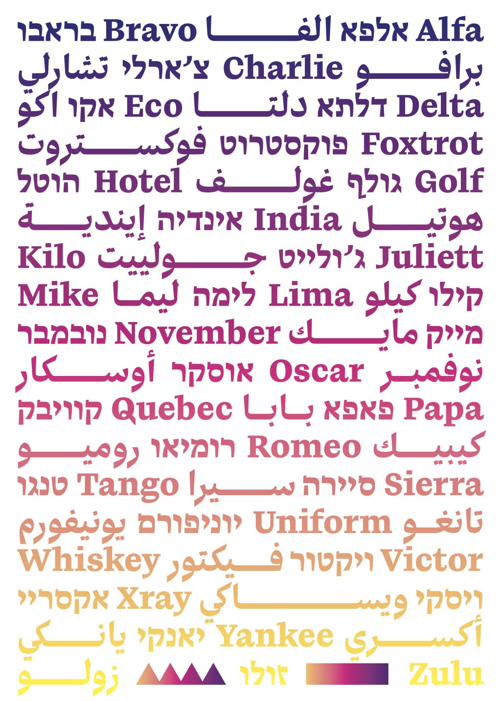 A contemporary Serif type family for continuous text and display. Israel, a multi-cultural arena, requires trilingual typographic solutions. This endeavor is particularly challenging as it involves crafting cohesive type systems encompassing Latin, Hebrew, and Arabic, each with unique characteristics. Despite the inherent complexities, maintaining cultural authenticity while adhering to consistent design principles across all scripts is crucial. Over the last few years, I have explored cursive letterforms as a secondary style within one Hebrew typeface (the notion of Italic is foreign to Hebrew). I aim to design type systems that pioneer the use of cursive styles and give Hebrew typographers the same possibilities as Western typographers have. Here, for the first time, an innovative approach emerged by developing a unique Arabic sub-style: drawing inspiration from traditional Ruqaa calligraphy, this style was meticulously selected for its distinctive visual qualities.