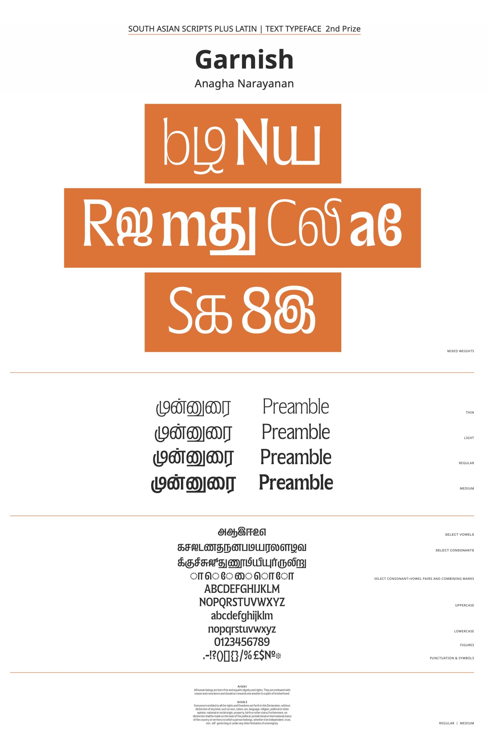 These text and sans styles are part of a larger family that also consists of a display style. The Latin & Tamil type family consisting of 3 subfamilies is designed to provide a rich typographic palette for editorial design. It questions the idea of optical sizes by proposing a display that is “same but different” from the text styles. The design space is inspired by typesetting of Tamil magazines which feature varied fonts in use in a single book. The modulated text subfamily is the basis of the 2 text subfamilies. This style does not tone-down the display but instead starts at a different point. It is a sturdy serif with wide proportions, generous curves and a fusion of varied references. The italic has vertical cut-offs on select terminals which is a take on Tamil’s italics being not a "true Italic" but more of a slanted style. The Sans is a grotesque that retains some of the peculiarities from the text style and the text duo is a nod to antique-grotesque pairs from 19th century.