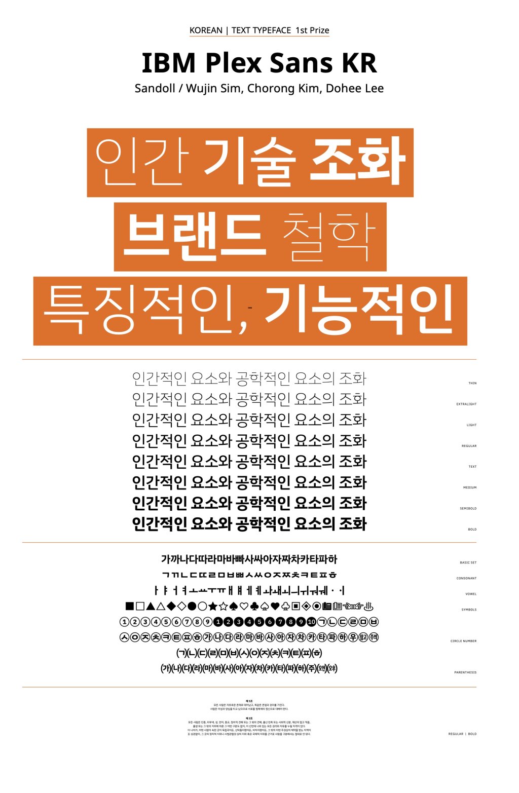 The concept of this typeface is a harmony of two styles: “mankind-natural” design and “machine-engineered” design based on the client’s brand design principles. When examining the details, first, in the ‘ , , ’ series, a refined ᄎᄌᄉ connection that seems to be systematized based on the writing form structure harmoniously blends natural and engineered styles. Second, in the ‘ , ’ series, a combination of smooth outer curves and ᄒᄋ mechanically systematized inner curves creates a unique impression. In addition, a strong ink trap is applied at the connection of the straight line and curve of ‘ ’ to maintain personality while ensuring consistent gray ᄒ balance. Third, the bottom ‘ , , , ’ are composed of a rounded left bottom and ᄇᄆᄅᄂ a squared inner part, creating a smooth and robust structure. Thus, this typeface is flexible, allowing for individualistic expression when used on a large scale and ensuring readability when used on a small scale, making it suitable for various situations.