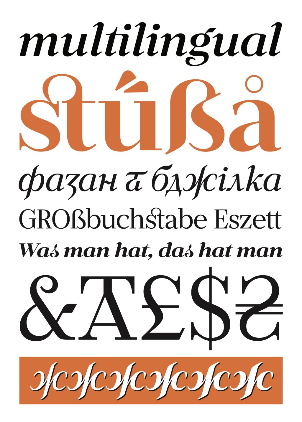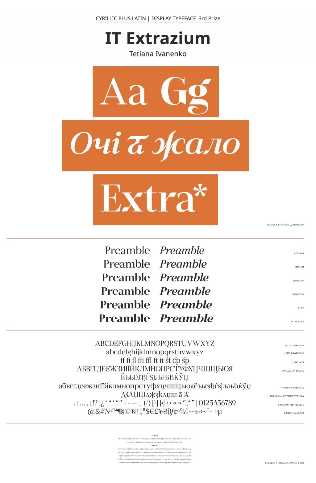 An elegant and slightly brutal, the font has all Open Type Latin Pro characters, Cyrillic, Ukrainian alternates + Experimental Ukrainian two- syllable ampersand for capital and lowercase letters (TA, та). The font has 12 styles normal and italic from Regular to Extra Bold. Supports change of punctuation depending on the case. 2022–2023