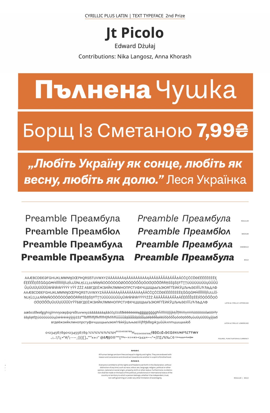 Jt Picolo blends the elegance of 19th-century Grotesque typefaces with a contemporary touch. The basic character set was drawn on paper, prioritizing modern letter proportions with a relatively large x-height. The research explored 19th-century high-contrast Grotesque typefaces, mainly from French, Dutch, and German type Foundries. My main motivation was to provide Cyrillic support for Ukrainian users during and after the war. Given my background in a Polish-Ukrainian family, my project must contribute to this cause. Its functionality makes it suitable for various applications, from editorial layouts to digital platforms.