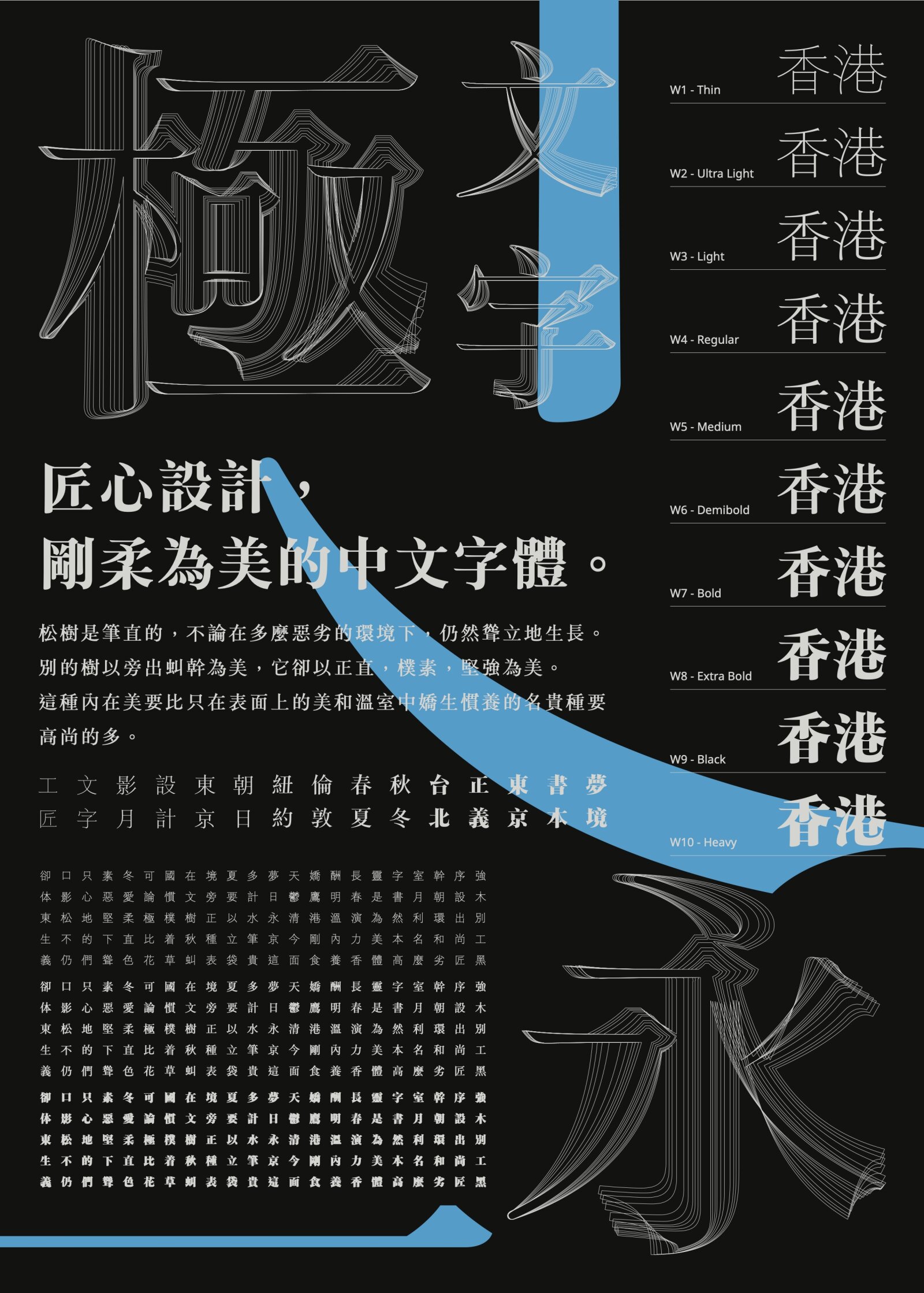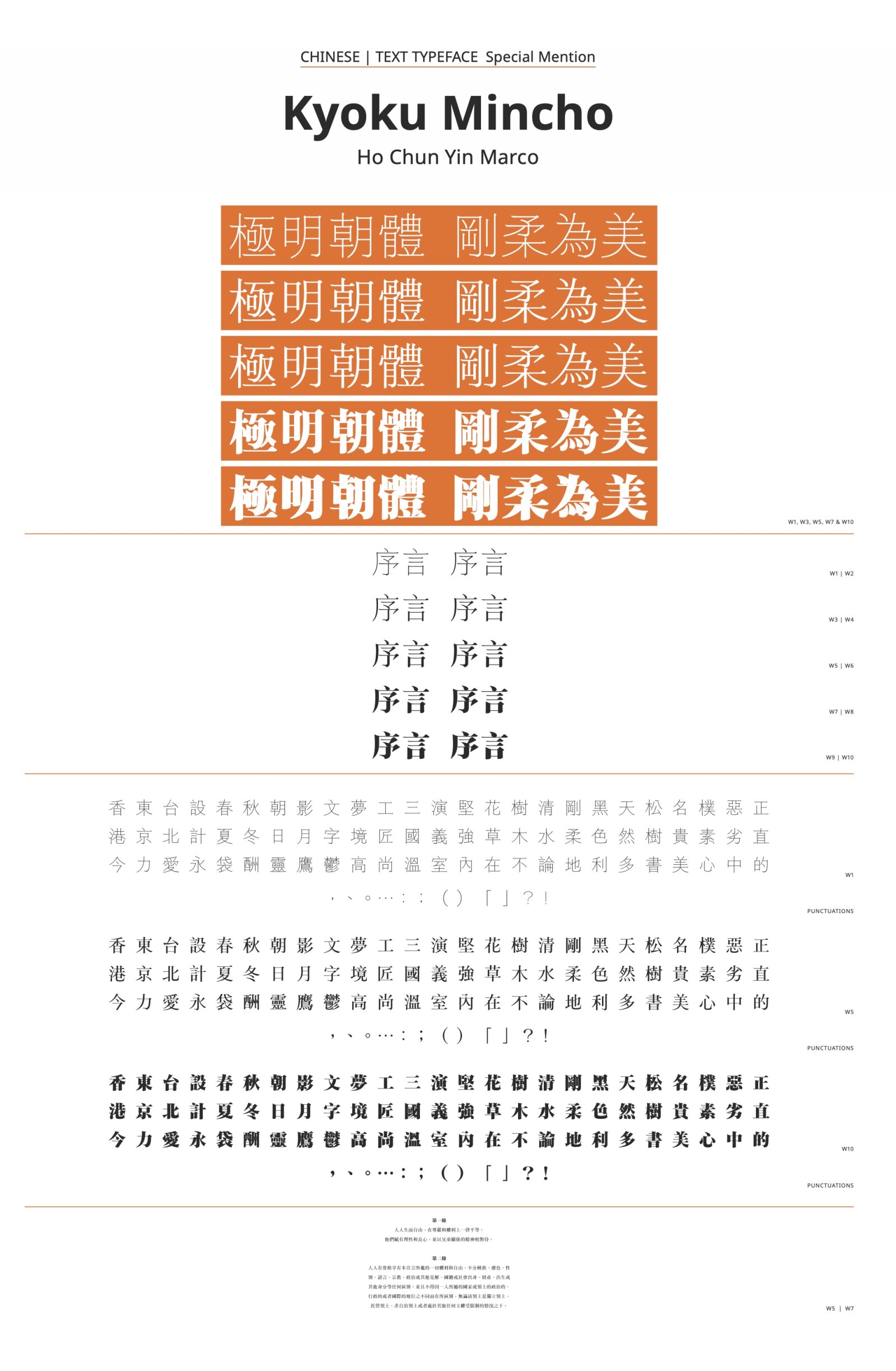 Since the variable font was announced, there are already more than 30 sets of Chinese variable fonts in the market but most of them are Gothic style. I was aiming to design a neutral, calm and plain Mincho typeface at the beginning. During the process of design, I realised there may be slight changes in feeling while adjusting the strokes. The typeface is designed with considerations of the feeling between soft and gentle to hard and strong by changing weight. The title of the typeface in Chinese means extremes, aiming to bring out two extreme feelings within one typeface.
