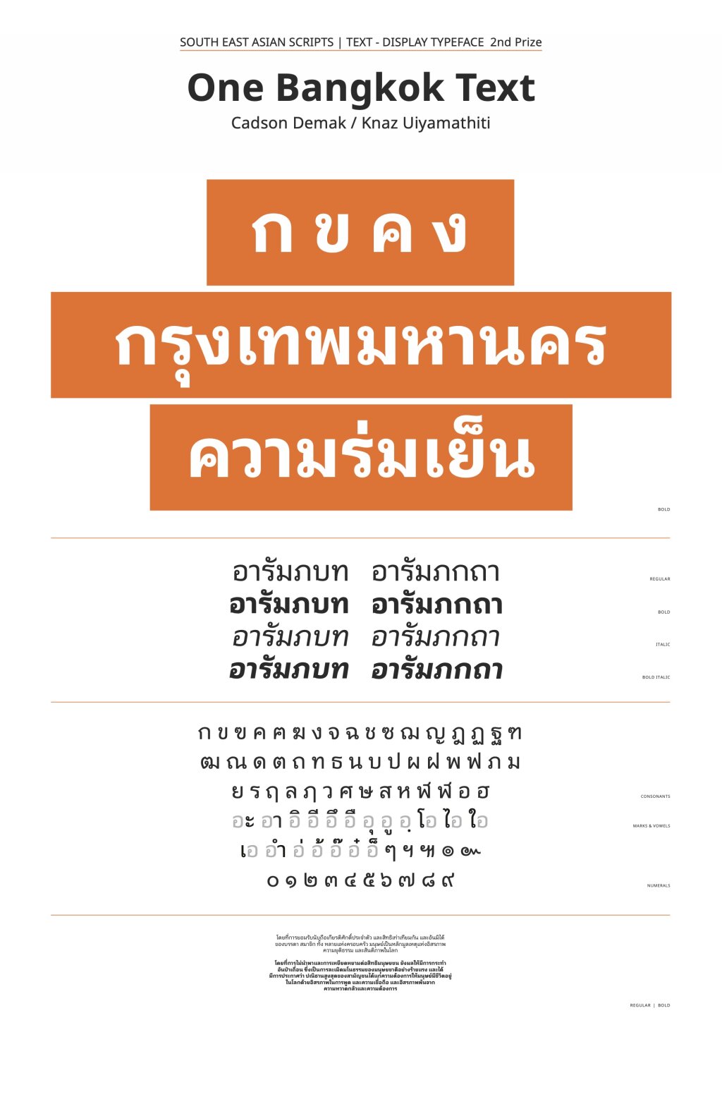 This font is a humanist Thai looped typeface that was designed for use as body text in public relations with a focus on mix-use consumers. It has 2 weights and 4 styles. This typeface was designed after its predecessor the display version, which required an accompanying body text that pairs homogeneously together. It was further improved for ease of reading by adding ink traps to reduce flares and increasing the spacing to allow more air through long texts. Distinctive features such as the decorative 'spurs' that are found from the brand’s original logo are lifted into the typeface as stylistic designs to ensure that they create a cohesive image with the logo.