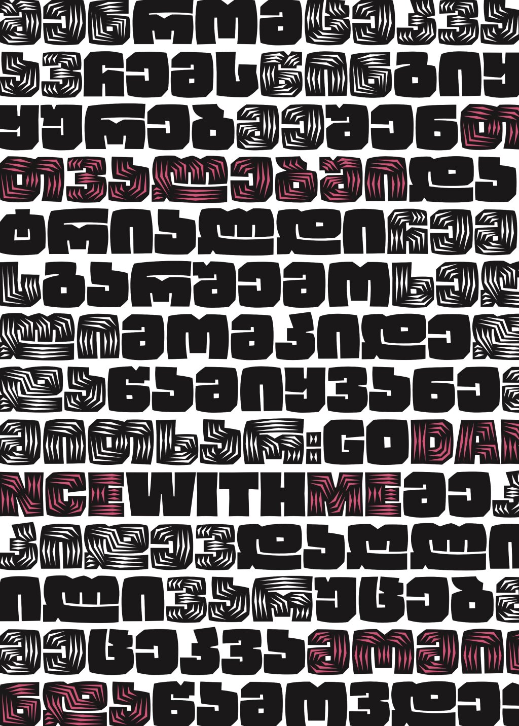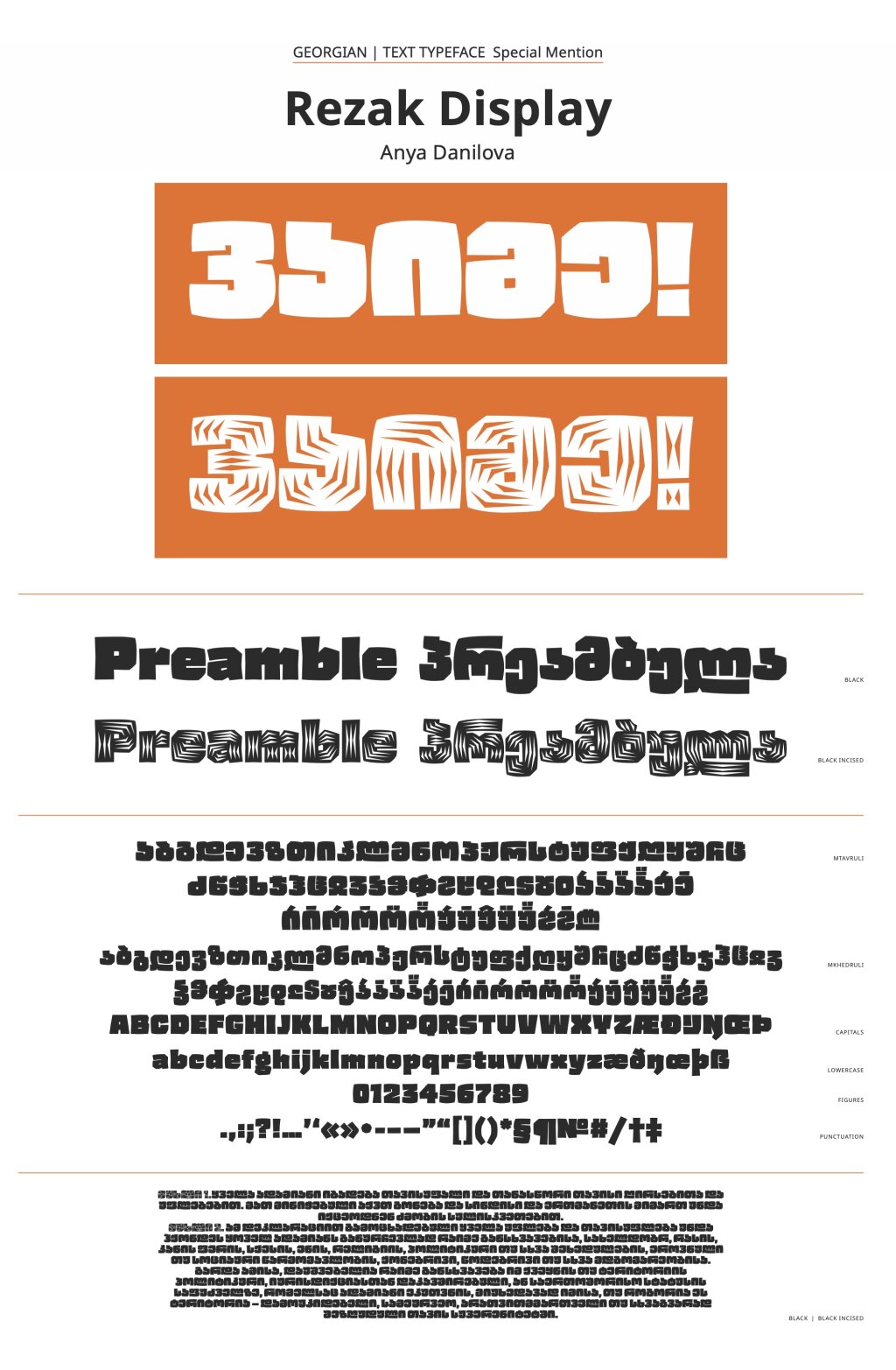 This characteristic font harmonizes its silhouette with a complex rhythm and incorporates a unique decorative style while maintaining the traditional forms of the Georgian "Mkhedruli" script.