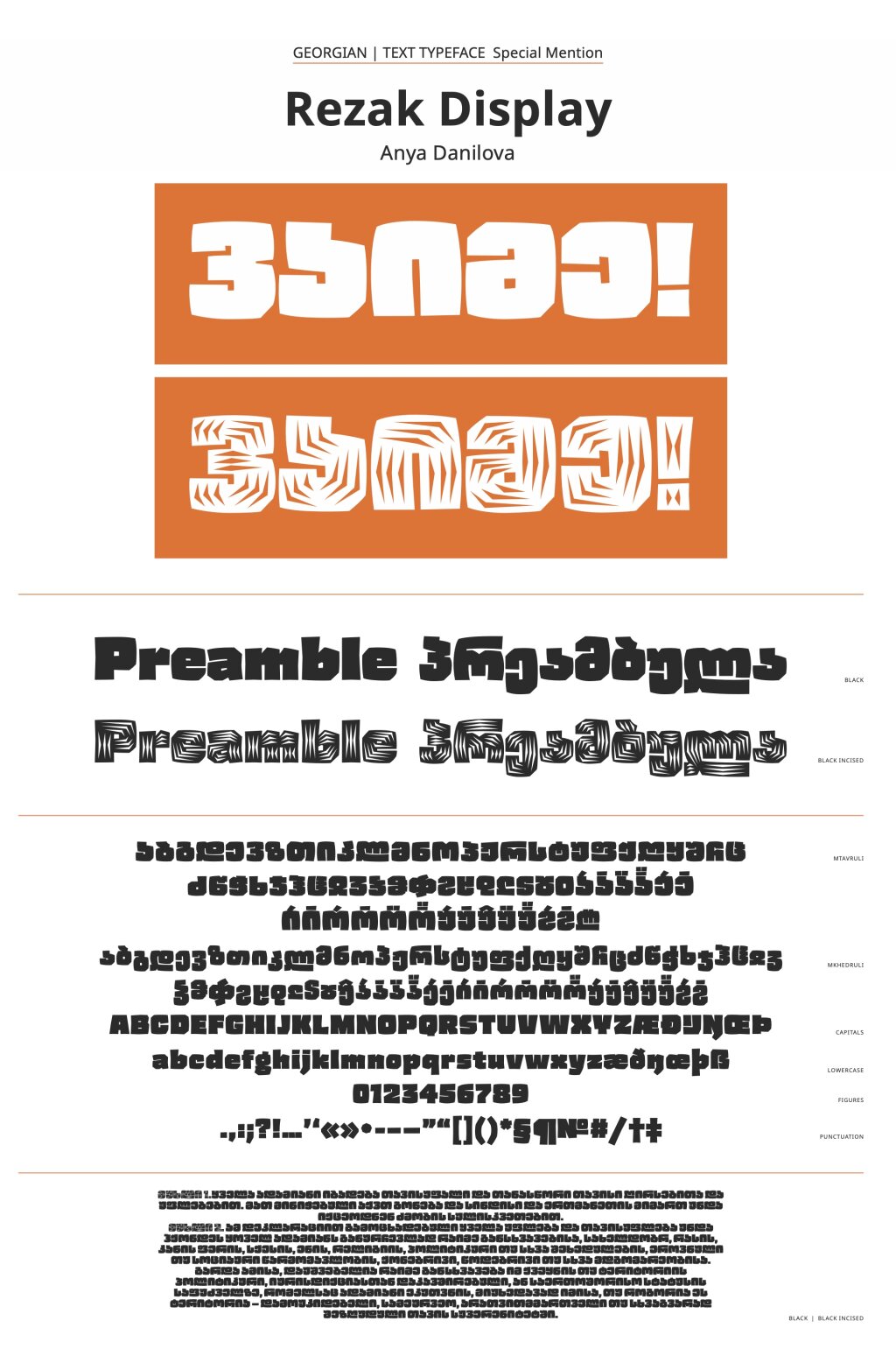 A typeface was inspired by cutting letters out of a material. With only a few cuts, the shapes remain dark and simple. With more and more cuts, the shapes become lighter and more defined. It started as a student project and for the sake of the concept had a one range between the darkest style (least cuts, sans-serif) and the lightest style (regular, serif). Now, the type family grew into having separate Text styles which are serif, and a complimentary Display styles which are sans-serif. The roughness and irregularity of strokes provide a strong character to a typeface and translating this character into other scripts such as Georgian was not only a challenge but a constant discovery of the possibilities of shapes. The Black style is truly the darkest and was made with as little "cuts" as possible while maintaining legibility. The Incised version is based on Black one and can be used overlayed with it, providing more opportunities for using color in design.