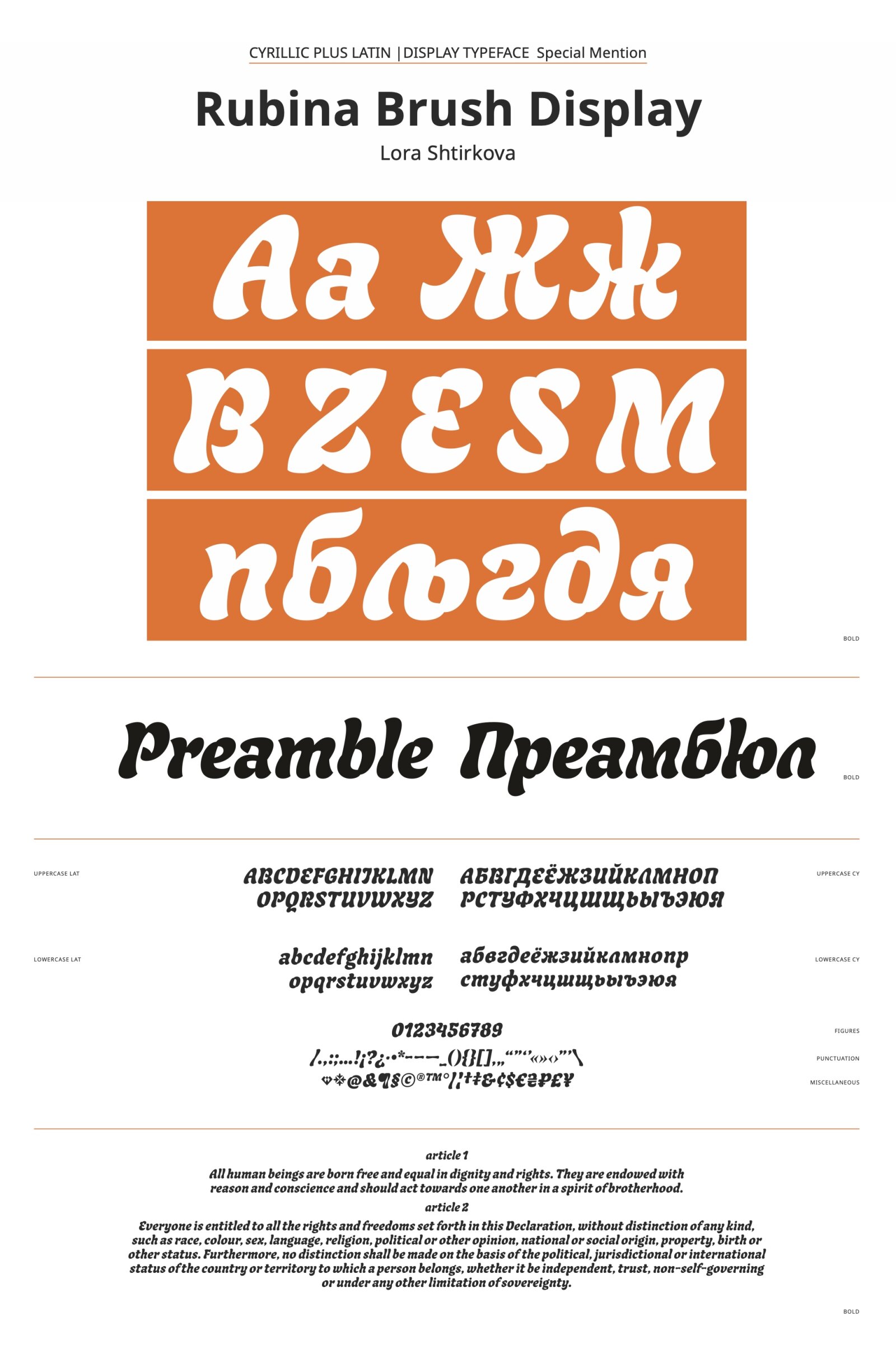 The typeface draws inspiration from the flat brush, highlighting its flexibility and the range of manipulations and rotations it enables. While calligraphy serves as the foundation, some referred to it as an ‘artificial brush,’ not because it truly is one, but due to its construction involving more pen lifts. Building upon this base, the design is further enhanced with hand-drawn elements. A distinctive characteristic is the ‘short overlap’ evident in the round letters, extending to the stems in a unique manner. During the process, the shapes in the Cyrillic enriched the Latin, and vice versa. The style is Bold, featuring a 10-degree slant that enhances its dynamic appearance, complementing the expressive shapes to achieve the desired outcome.
