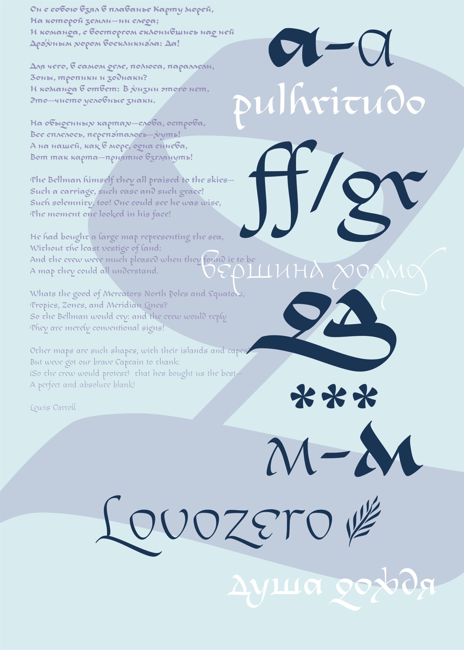 Snark is a calligraphic typeface based on the author’s interpretation of Russian unique script from the 16th–17th centuries which is called Skoropis’. Its name comes from Lewis Carroll’s poem “The Hunting of the Snark” and, like the poem itself, symbolizes the pursuit of happiness. The idea for the typeface was born during the study of historical scripts and calligraphic experiments with them. Skoropis’ is one of my favorite writing styles—bright, distinctive, and polyphonic, with wonderful graphic techniques that can work in modern design. Despite the typeface being a modern interpretation, it still retains the main features of Skoropis’. Snark works well in both large sizes and texts, and is particularly suited to poetry.