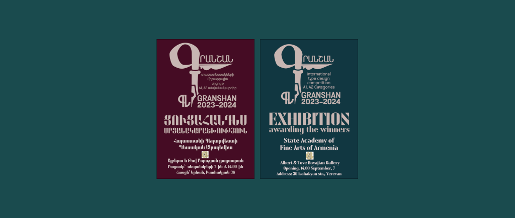 In the exhibition you will find the two typefaces from Edik Ghabuzyan, that are a part of his recognition with GRANSHAN Honor Medal. Here is a short description: