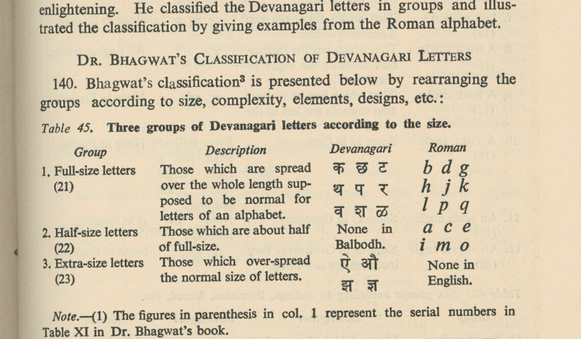 The foundation for such vocabulary was first laid by S.N. Bhagwat (1961) and Bapurao S. Naik (1971), whose Typography of Devanagari remains a cornerstone text. Naik divided letterforms into five categories based on their vertical stem and their relationship to the shirorekha, the horizontal headline that defines the script’s distinctive rhythm.